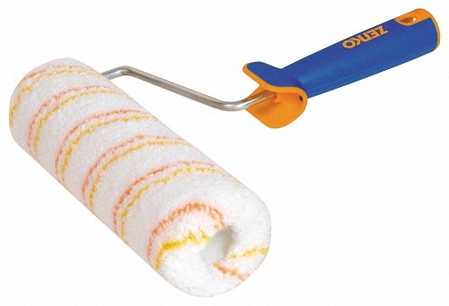 Rodillo de microfibra blanca, altura 9 mm. raya naranja y amarilla. tubo polipropileno 50mm, 180 mm., tapones polipropileno blanco, sistema con tornillo.