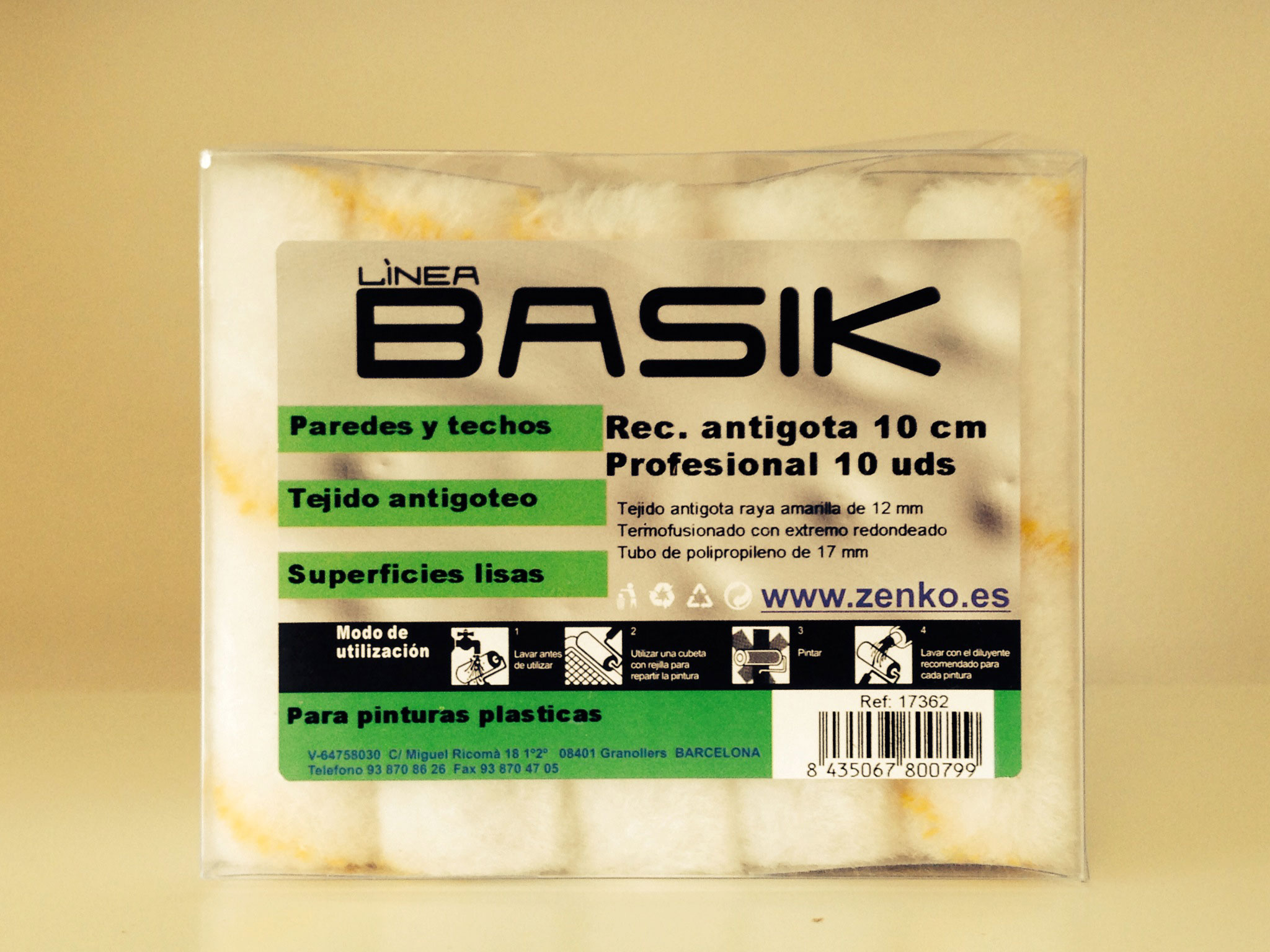 Rodillo de hilos largos poliacril blanco raya amarilla. Altura del hilo 12 MM. Sistema termofusión 50 MM. Mango plástico verde.